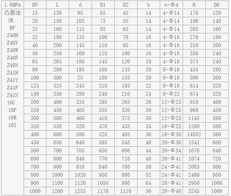 Z41楔式閘閥主要尺寸及重量: