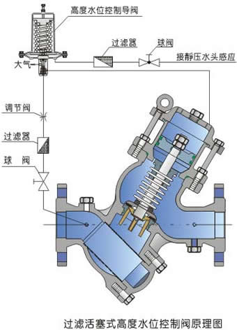 本閥利用水箱(水塔)設(shè)定的高低水位的靜壓水頭之差,通過水位高度導(dǎo)閥來控制主閥敏感元件活塞的上下運動以達(dá)到主閥的啟閥。當(dāng)水箱的水位升到設(shè)定的高水位時,主閥關(guān)閉,停止向水箱供水;當(dāng)水箱下降到低水位時,主閥打開,向水箱供水。通過調(diào)節(jié)高度水位導(dǎo)閥的調(diào)節(jié)螺桿,可以設(shè)定高低水位。