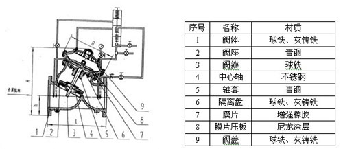 本公司生產的(DY30AX)緩開緩閉止回閥有閥體、閥蓋、閥瓣、閥桿、彈簧、導閥等零件組成。上閥蓋與下閥蓋之間為隔膜腔,隔膜腔內設隔膜,隔膜與中心軸連接,中心軸另一端連接閥門,閥門與閥座接觸。水容器與上閥蓋進水、出水控制孔連通,水容器與上閥蓋出水為節流連通,水容器與上閥蓋進水為單向連通。